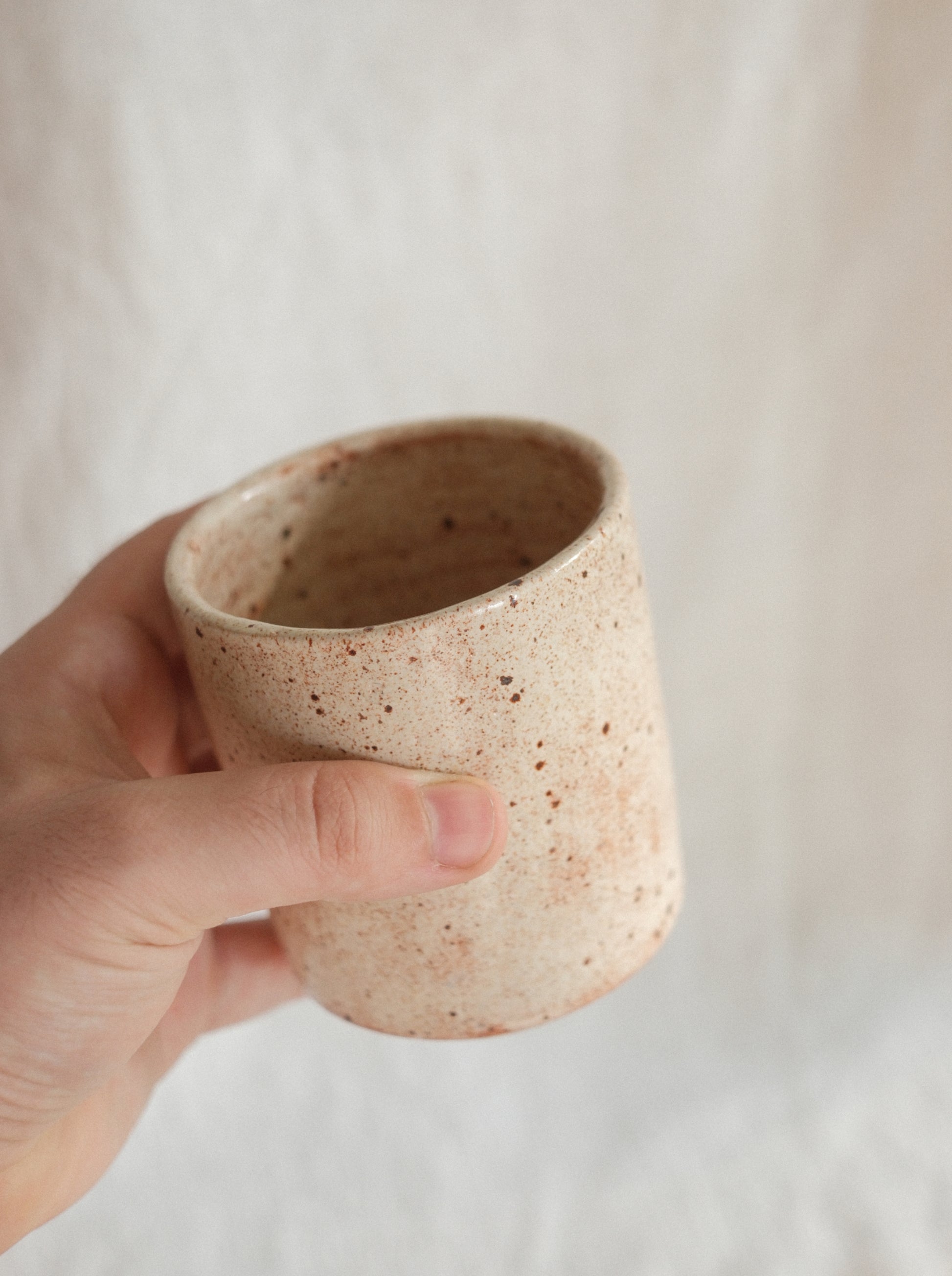 The cup has been thrown on the wheel using a flecked stoneware body and coated with a light blush pink glaze that reacts strongly with the iron flecks. The result is a mottle cream and pink with small, intense areas of deep pink.