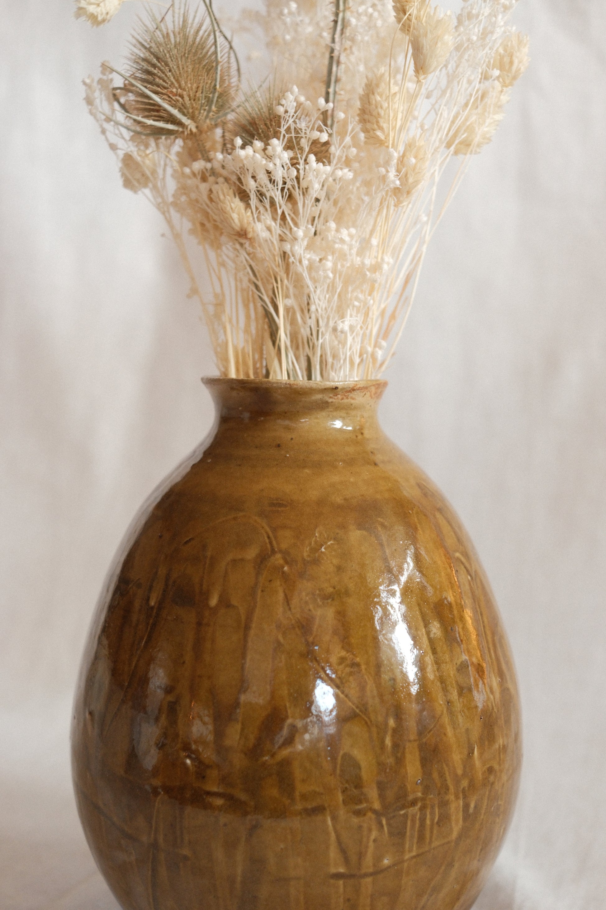 This large vase was thrown on a wheel in mixed stoneware and decorated with two distinct slips before being glazed in a deep amber glaze.