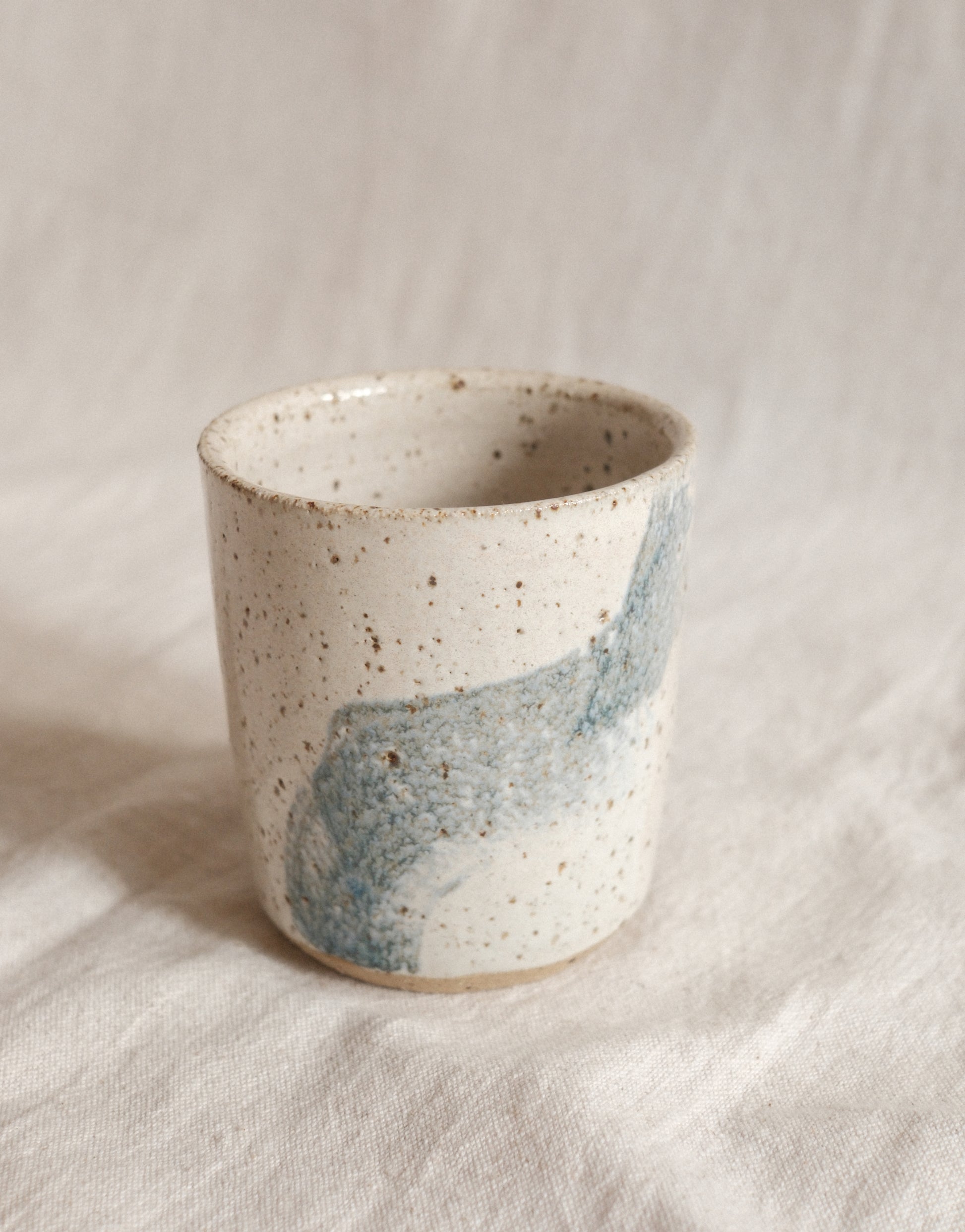 A small, handless coffee cup. Glazed in a shiny cream with blue brush strokes.