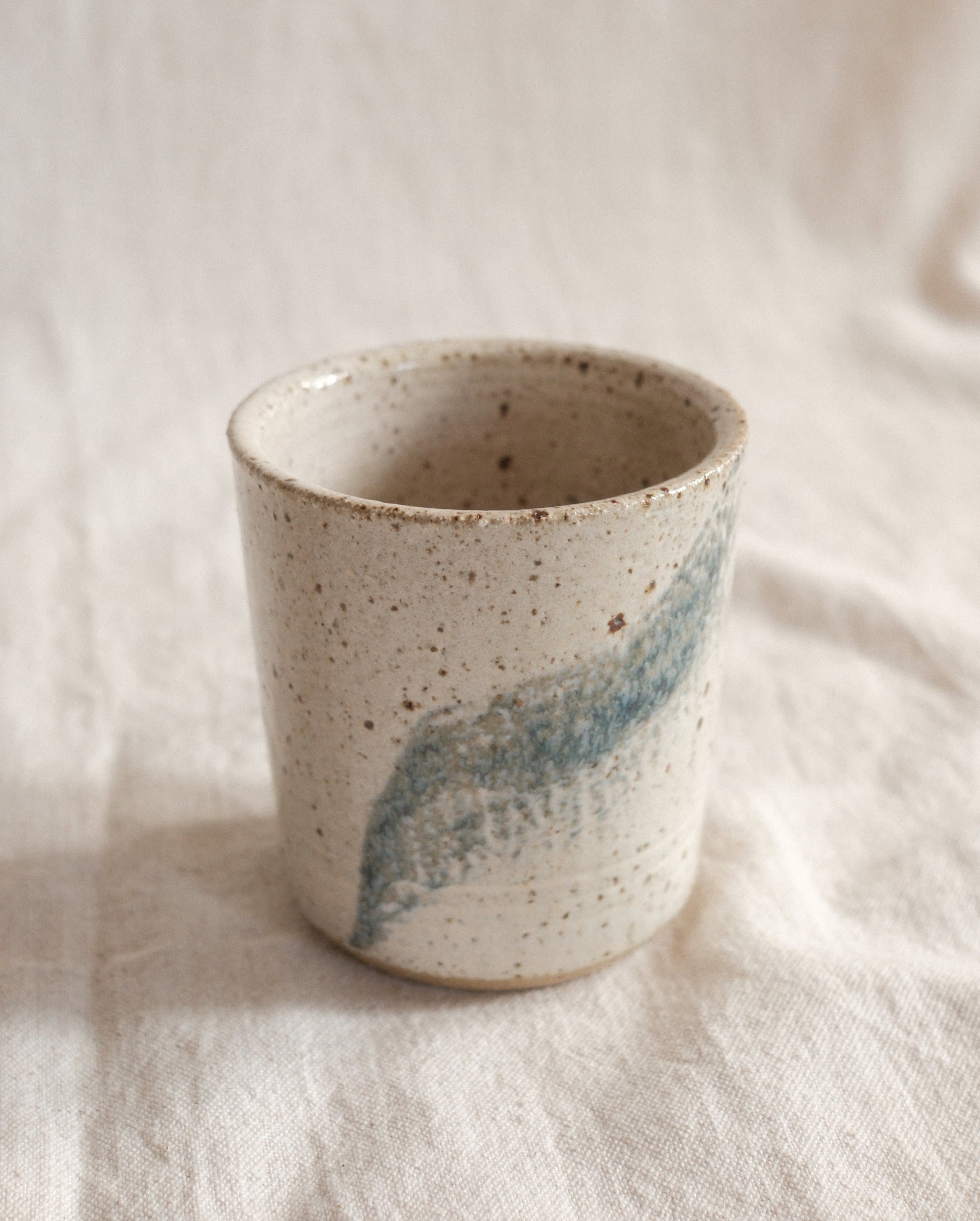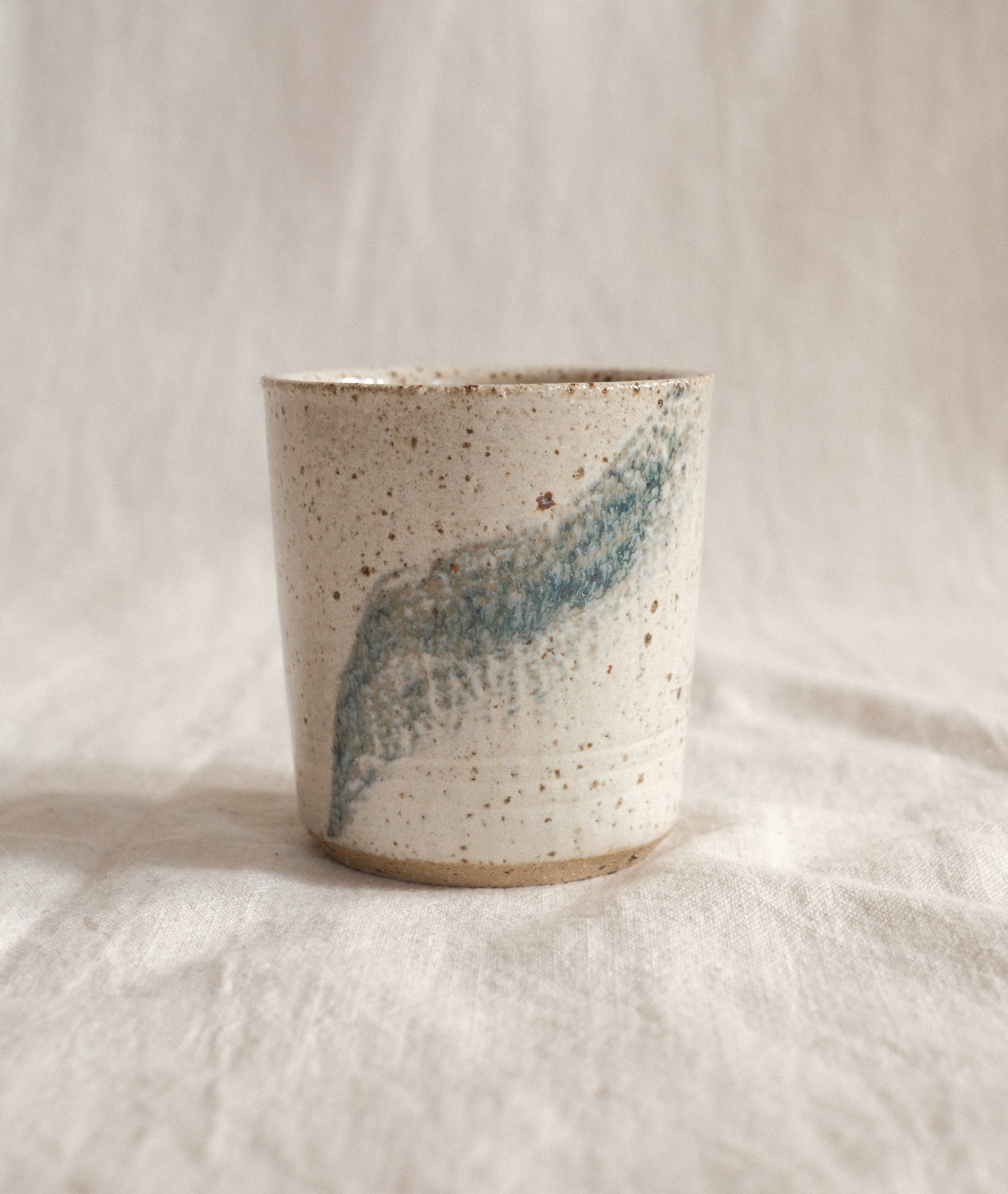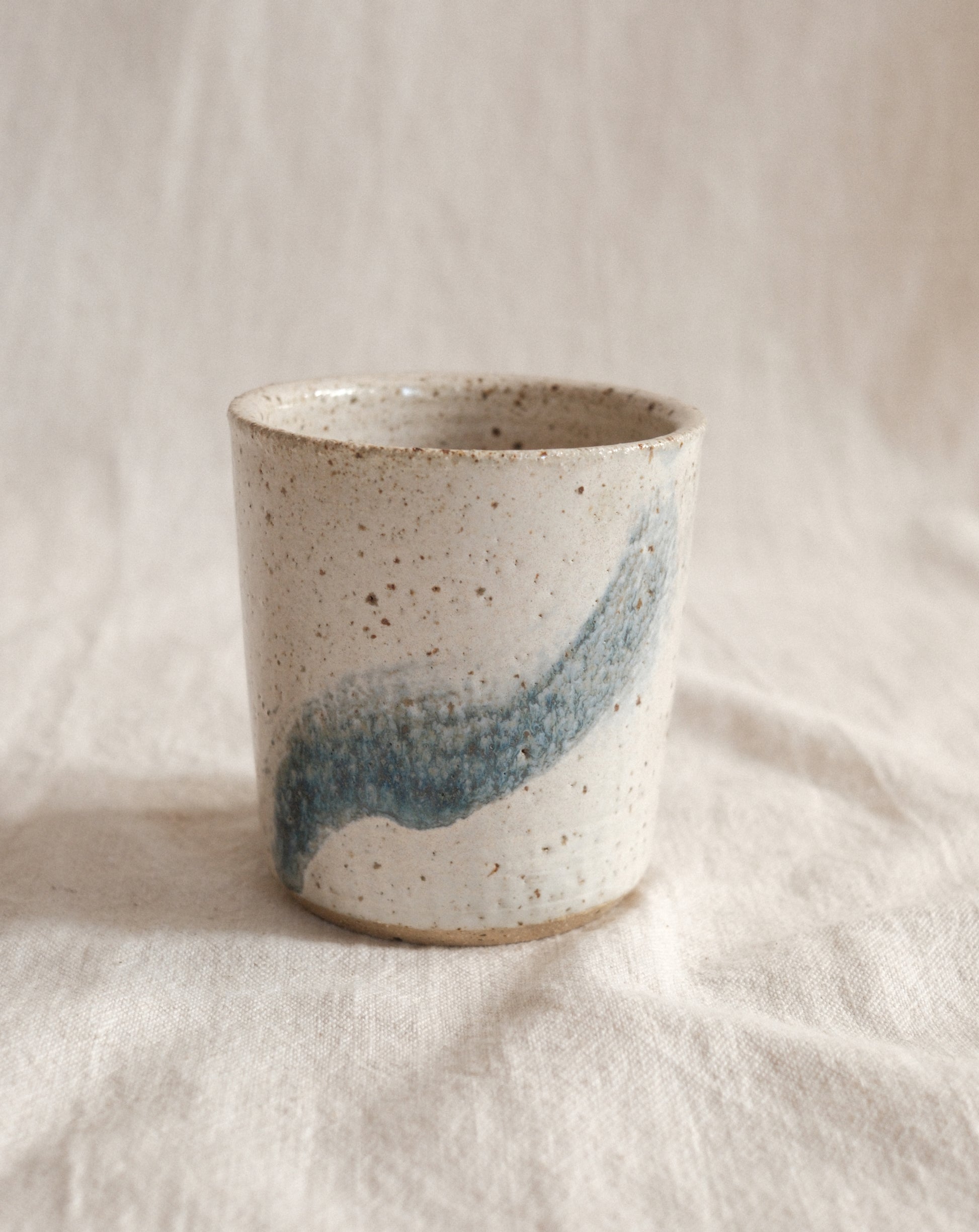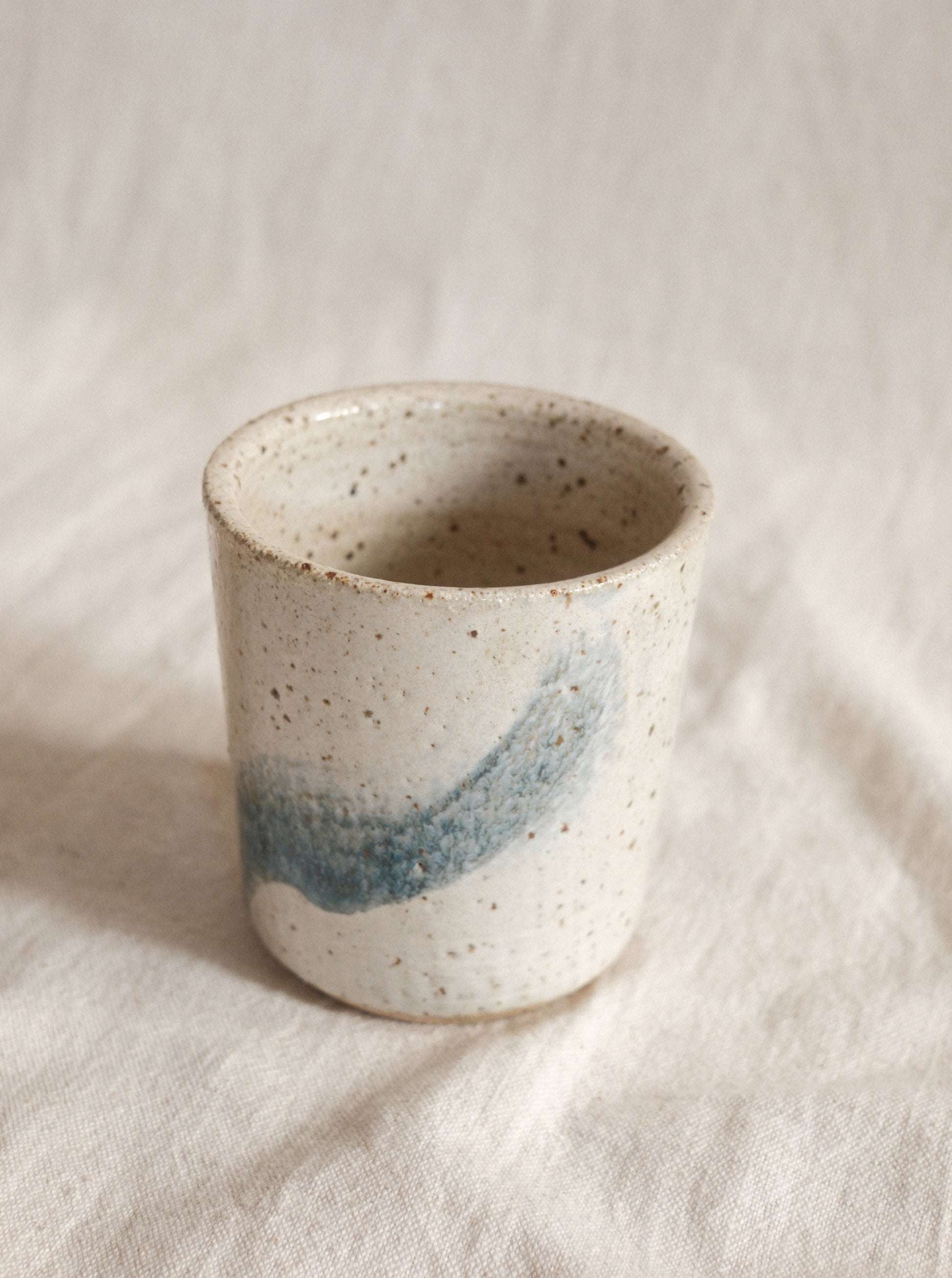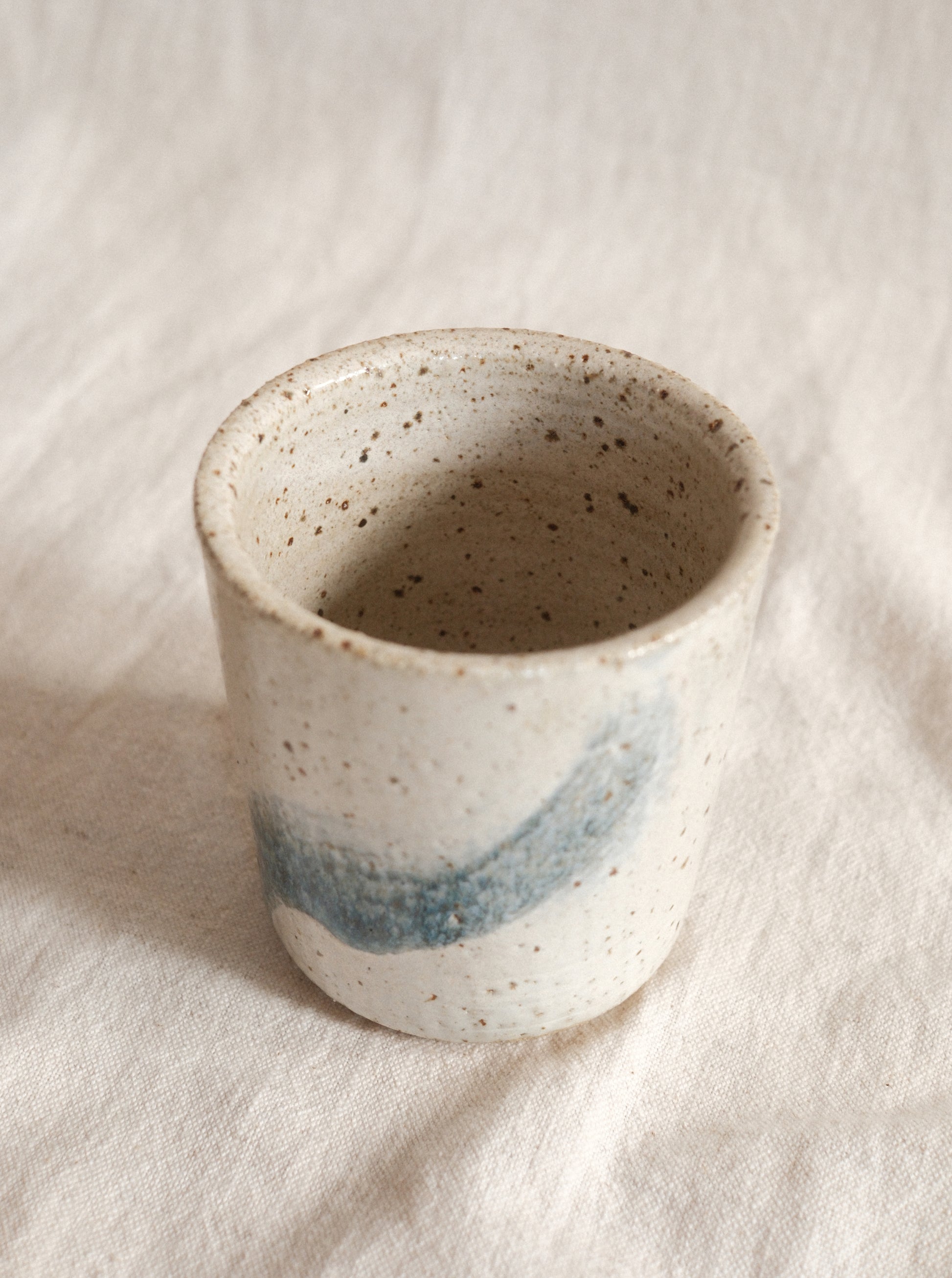 A small, handless coffee cup. Glazed in a shiny cream with blue brush strokes.