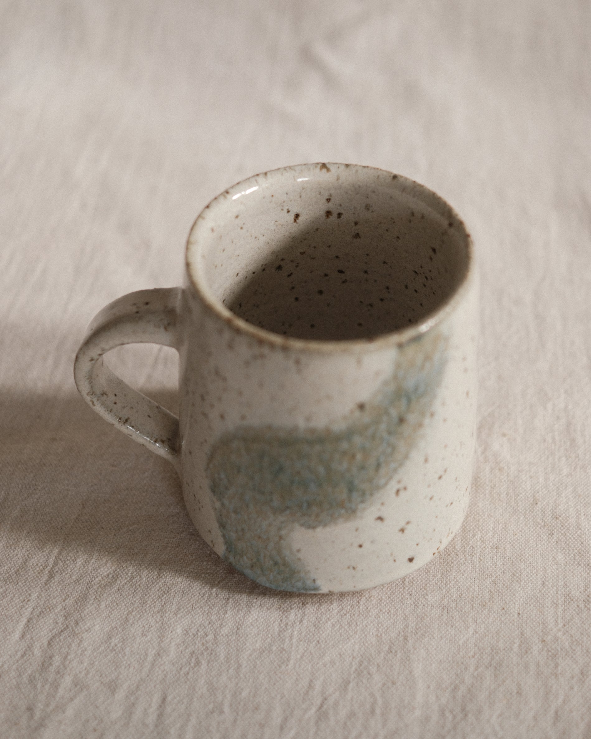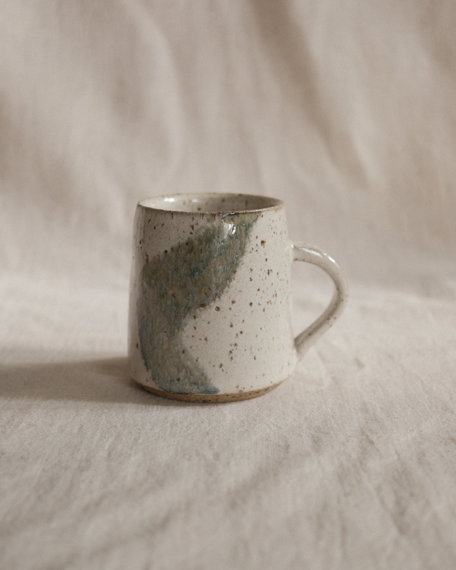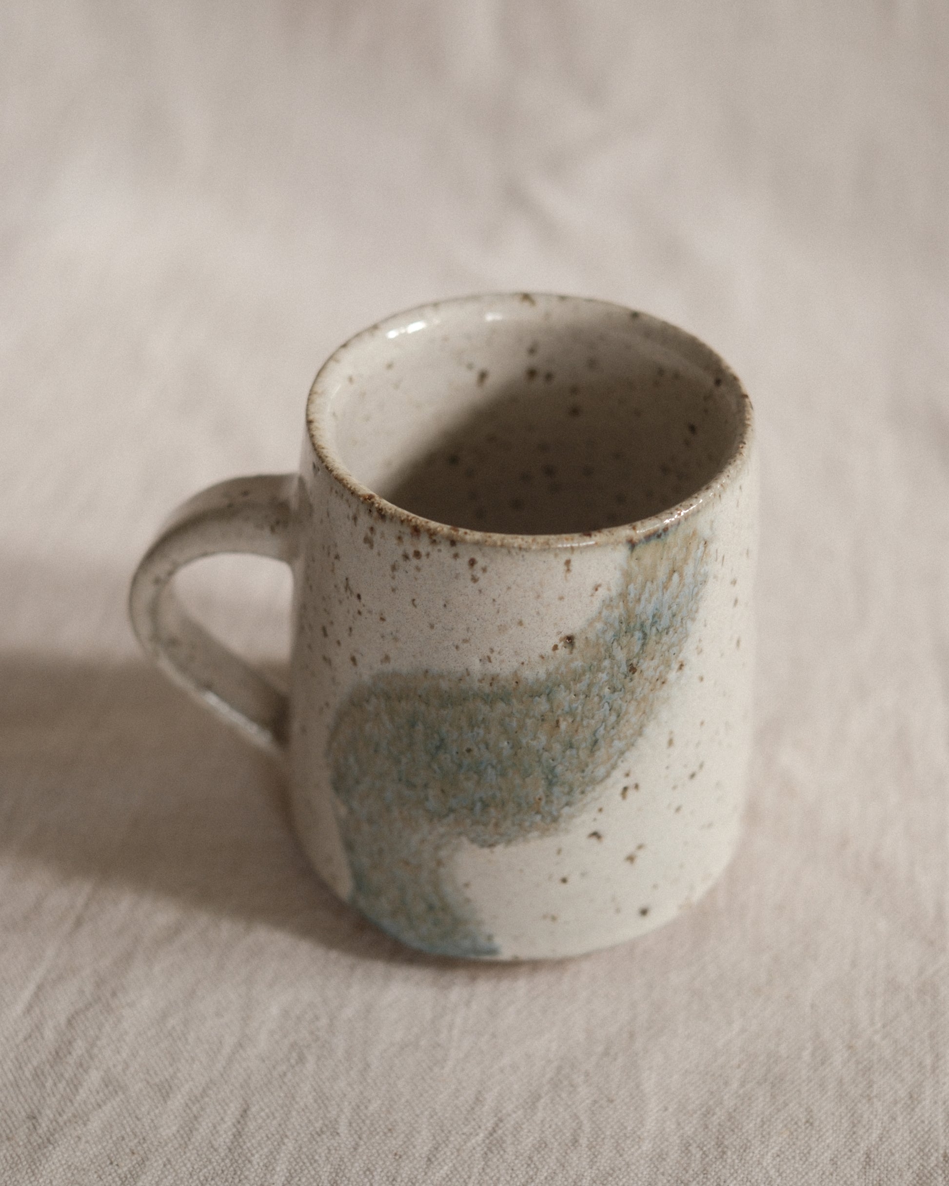 It's thrown in a flecked stoneware with a low handle that's pulled from the cup itself and glazed in a shiny pale white and brushed with colour.
