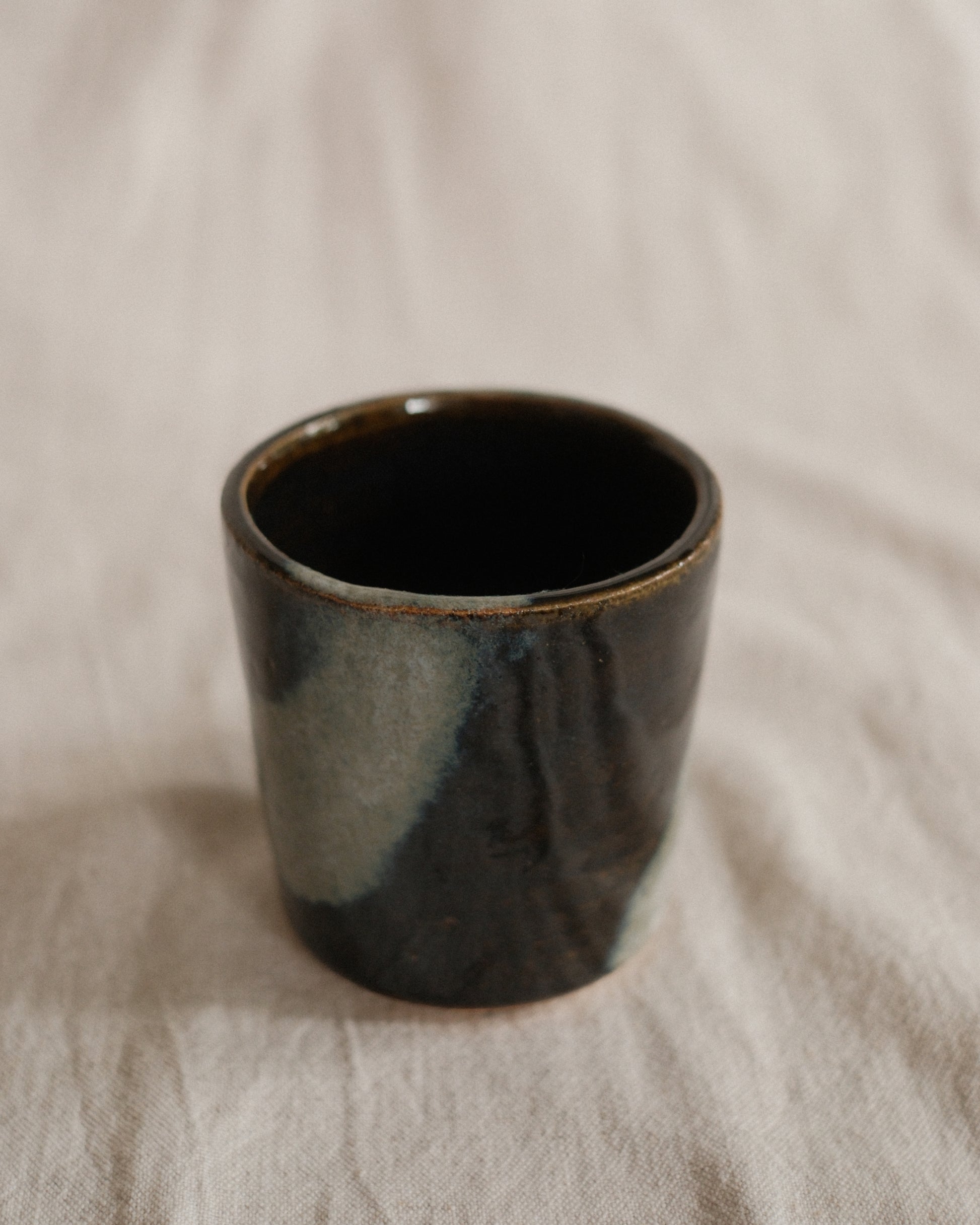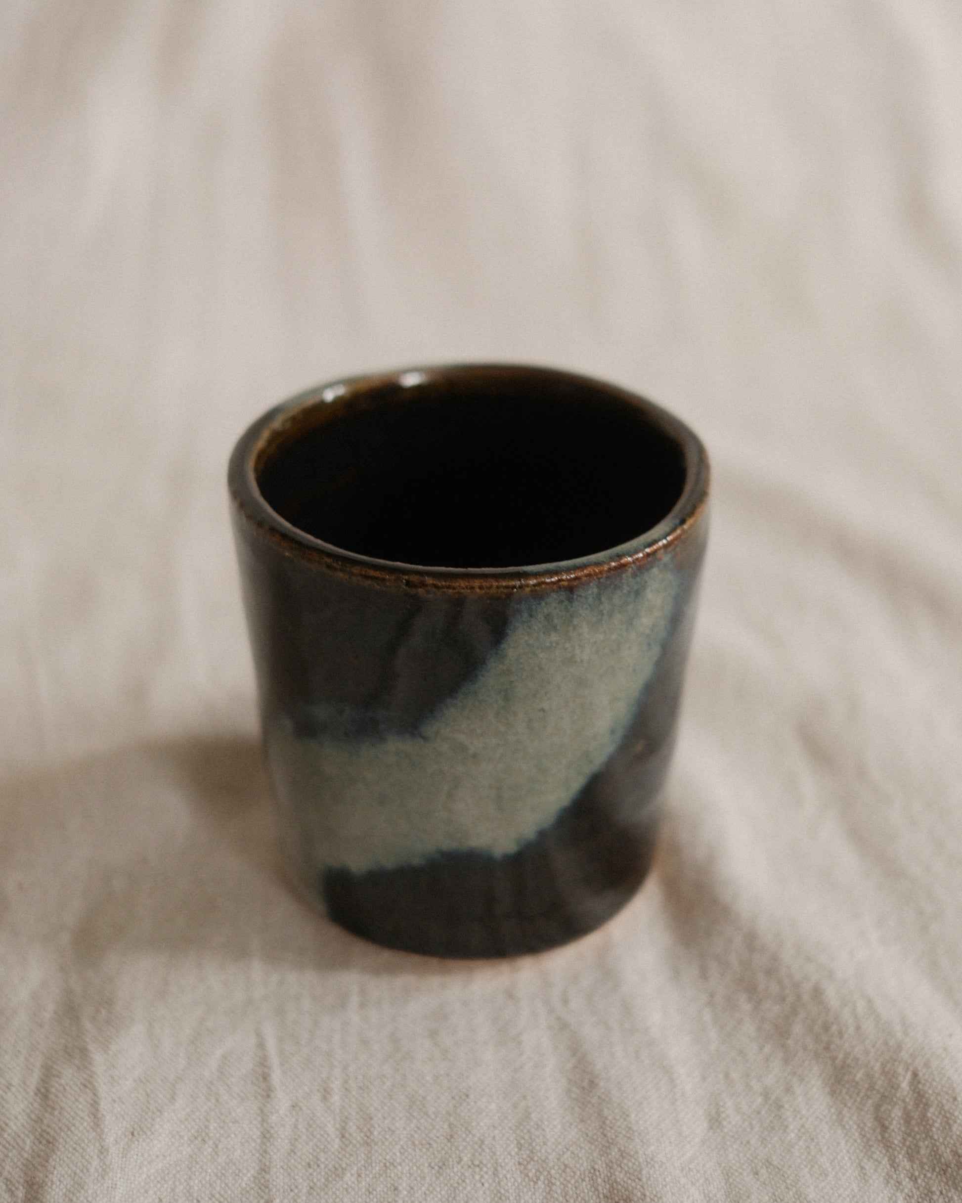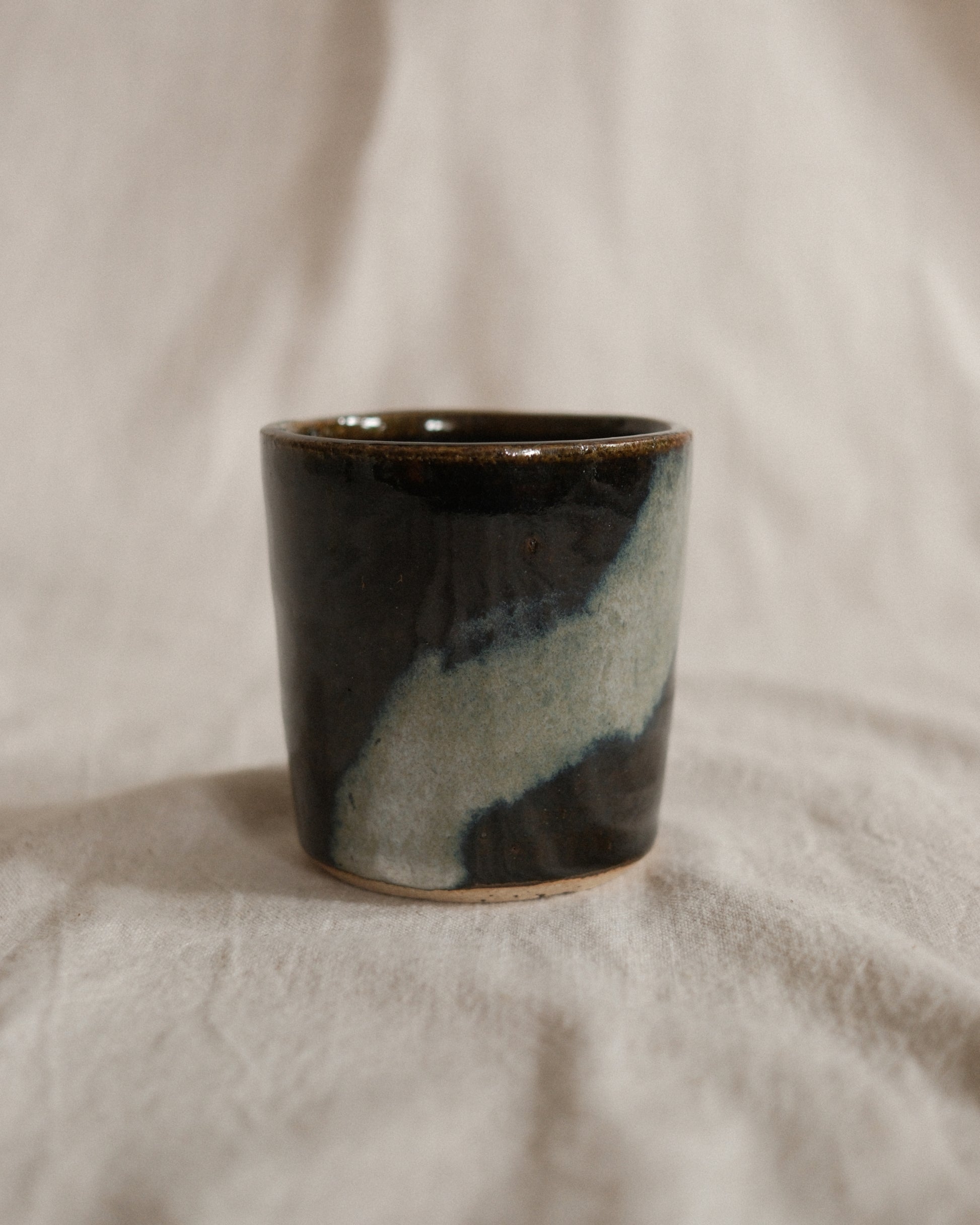 A small, handless coffee cup. Glazed in a shiny cream with blue brush strokes.