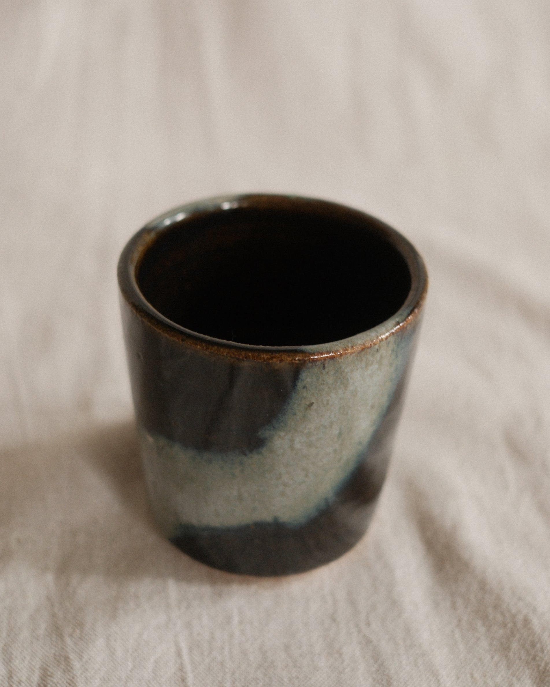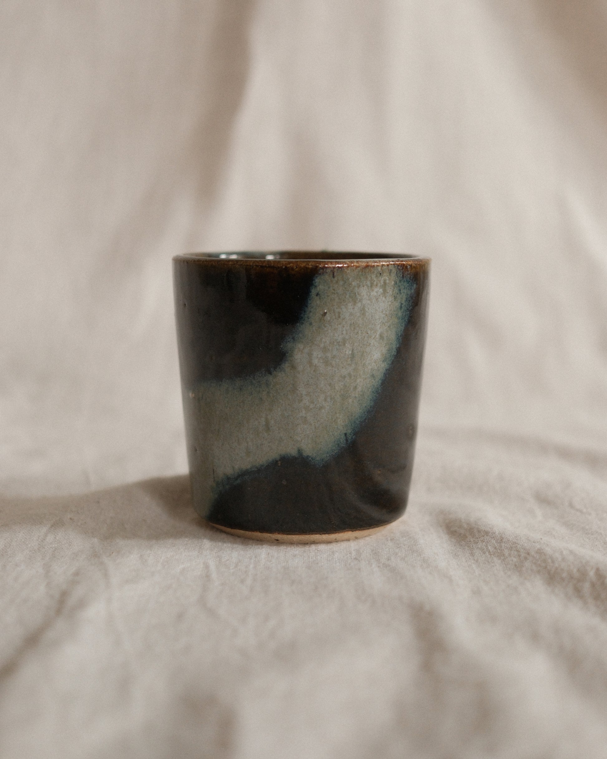 A small, handless coffee cup. Glazed in a shiny cream with blue brush strokes.