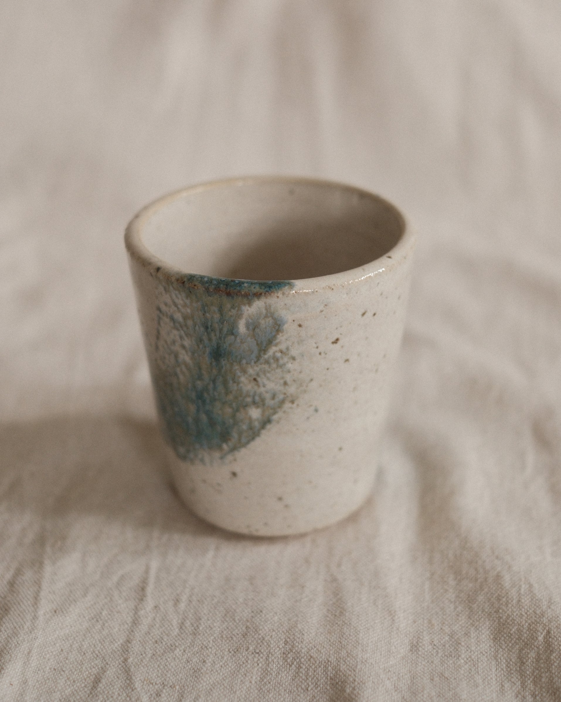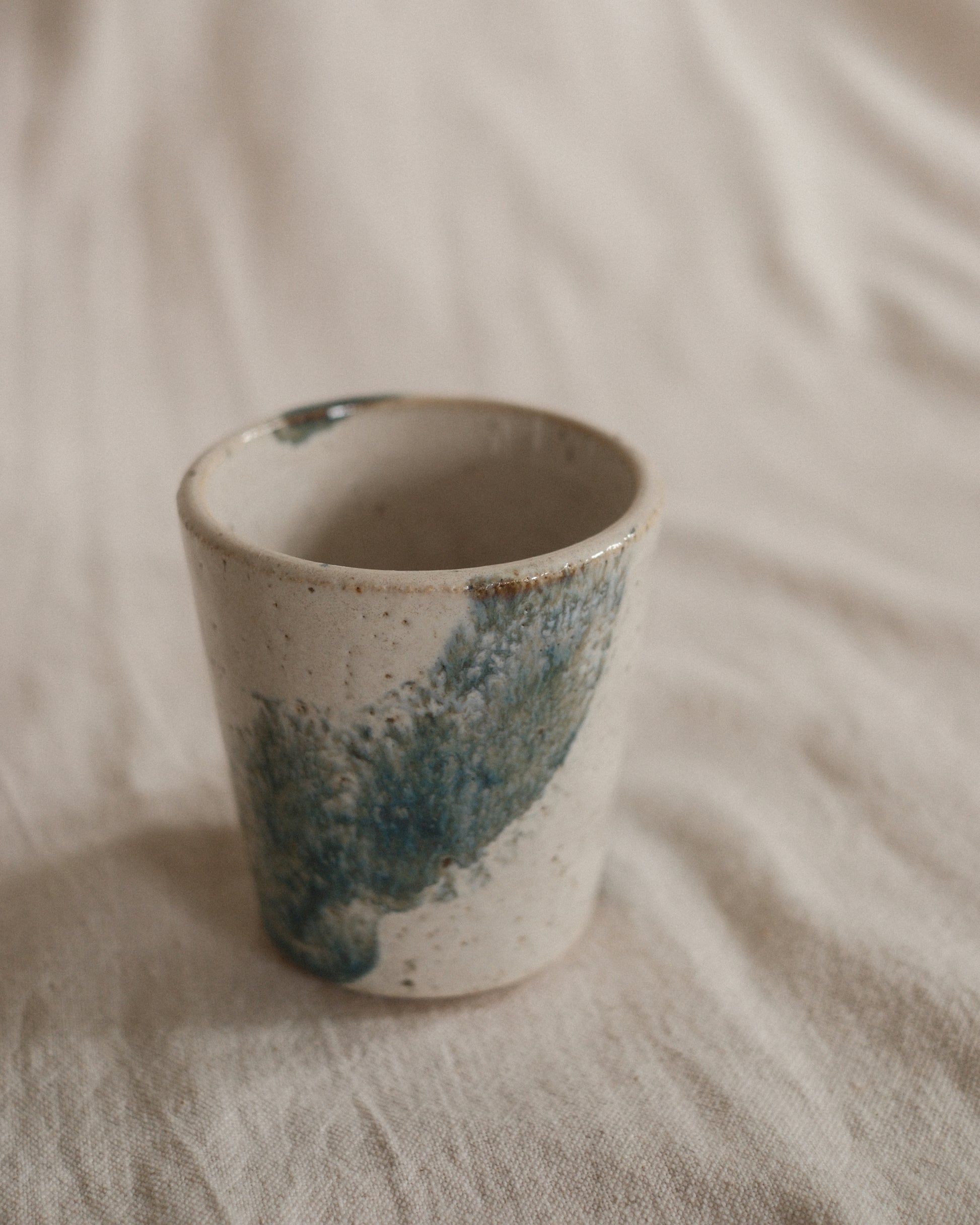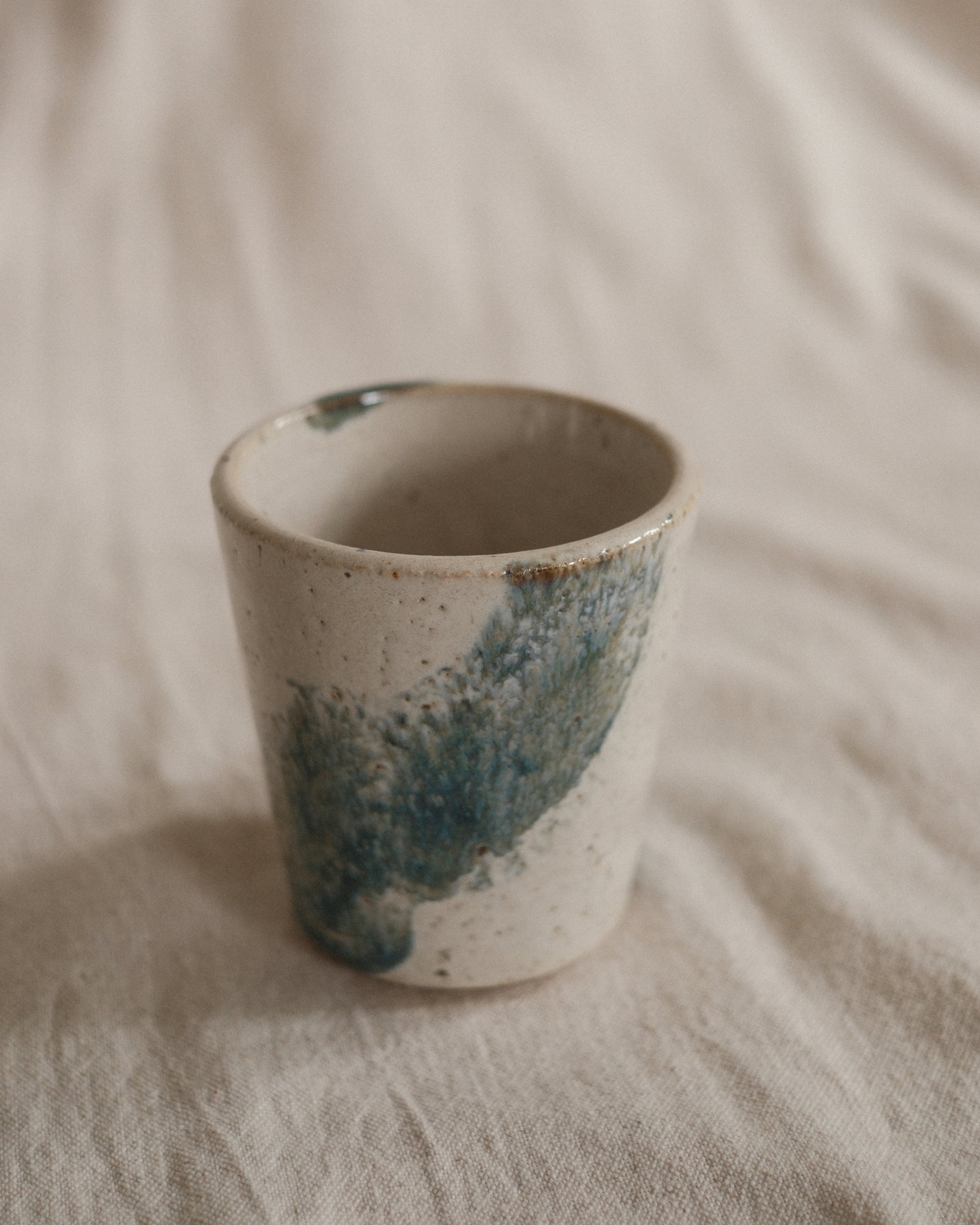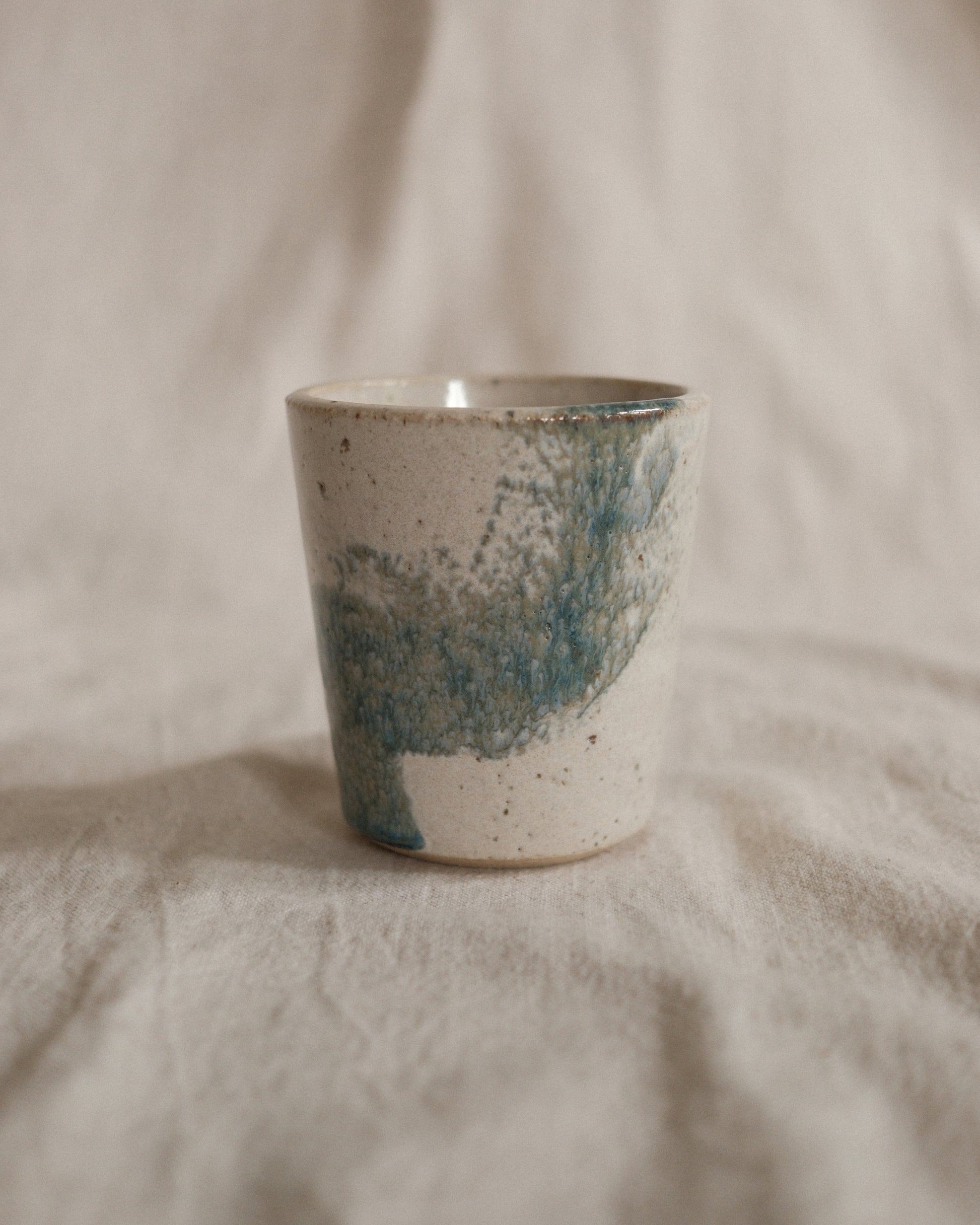 A small, handless coffee cup. Glazed in a shiny cream with blue brush strokes.