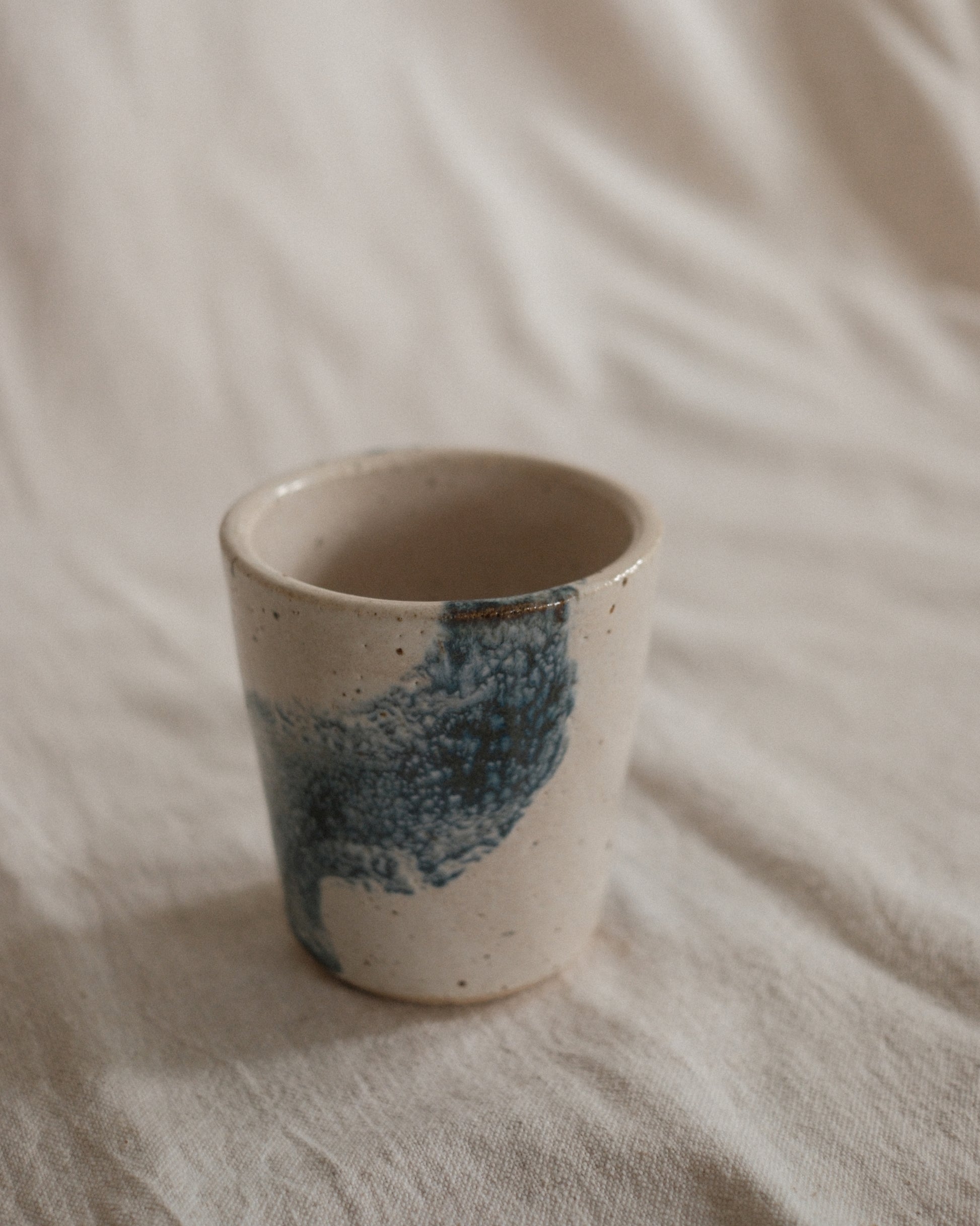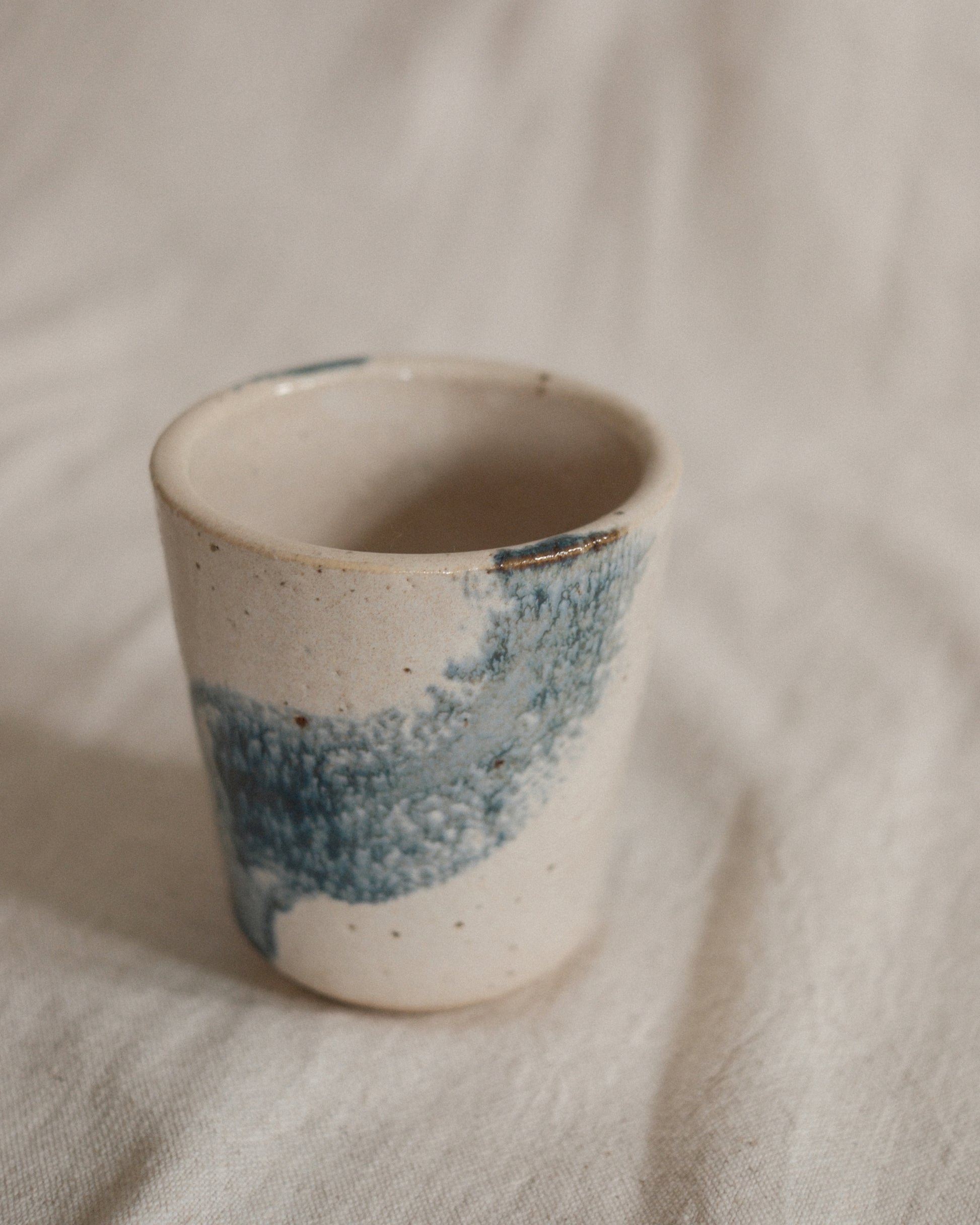 A small, handless coffee cup. Glazed in a shiny cream with blue brush strokes.