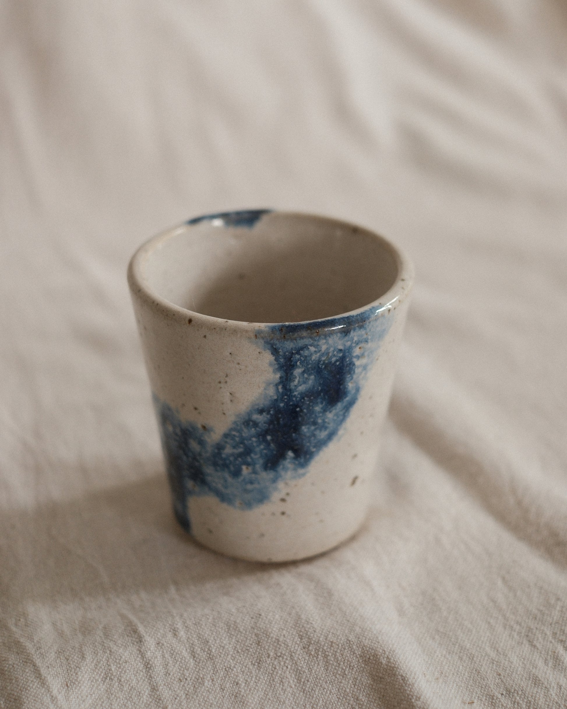 A small, handless coffee cup. Glazed in a shiny cream with blue brush strokes.