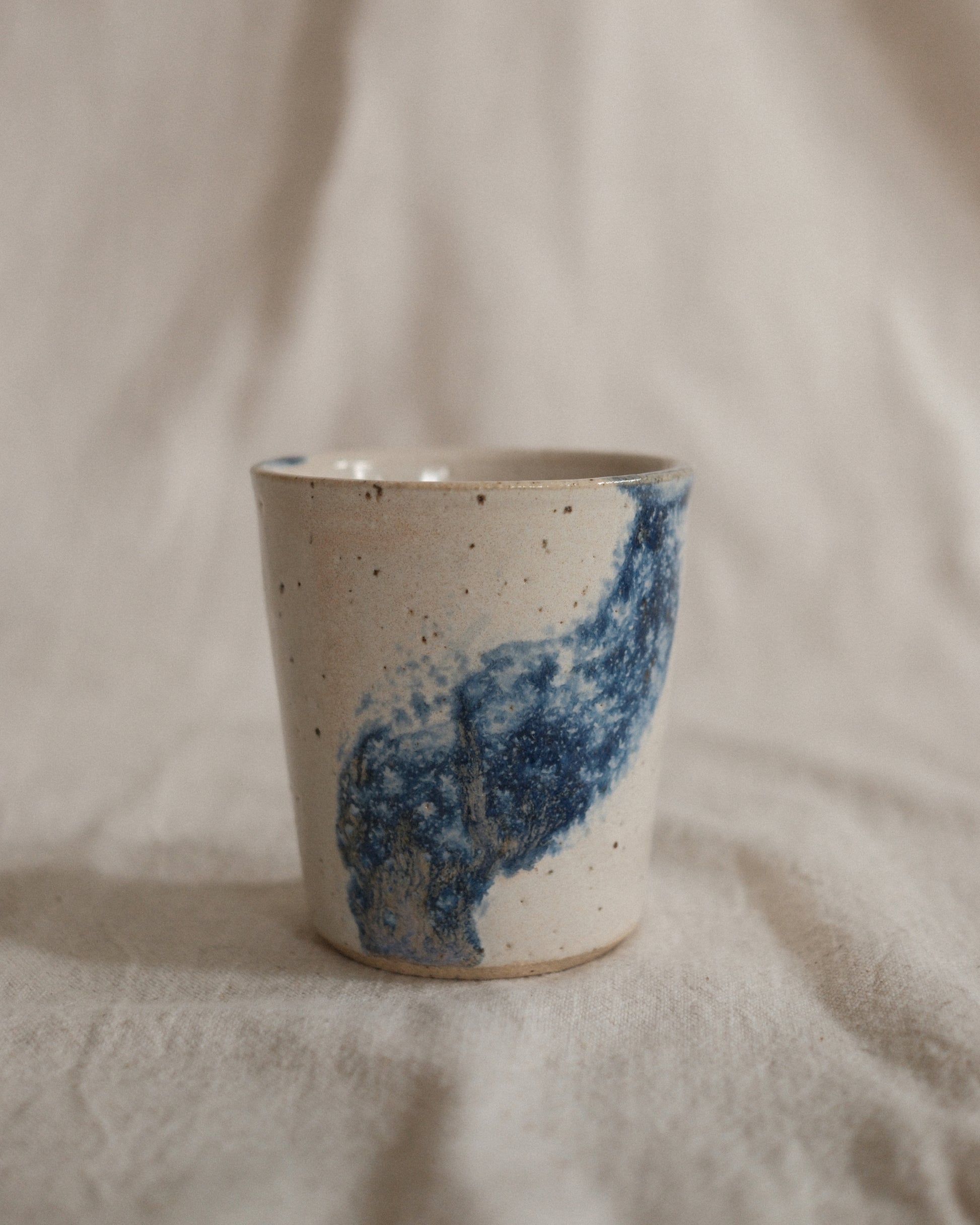 A small, handless coffee cup. Glazed in a shiny cream with blue brush strokes.